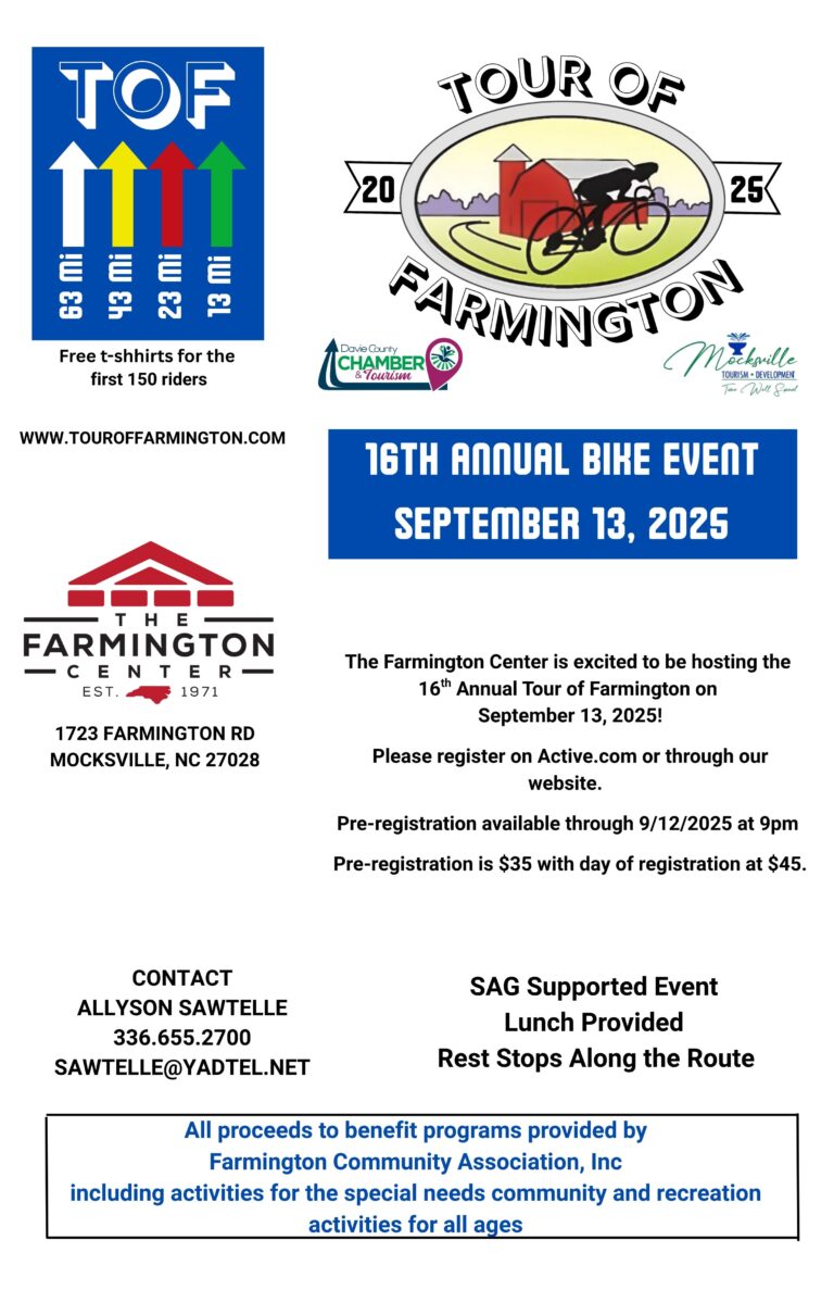 All rides begin and end at The Farmington Center – 1723 Farmington Road – Mocksville, North Carolina 27028